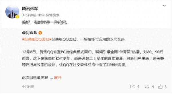 站长之家(ChinaZ.com)12月9日 消息:今日,腾讯公关总监张军针对经典版QQ回归一事发文回应称:“偏好,有时候是一种轮回。”这一言论迅速引发网友关注与讨论。